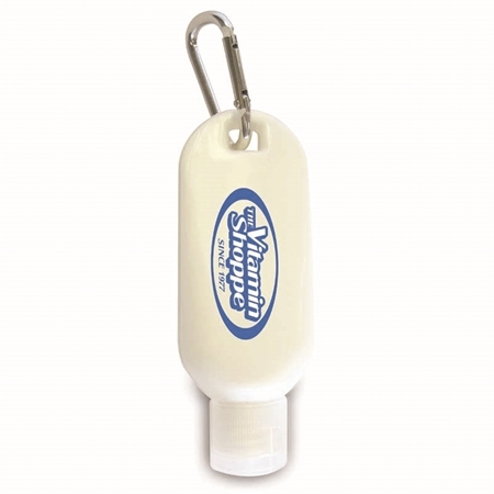 Custom Promotional Tottle Bottle Tropical scented sunblock. 2 oz. / 59 ml in white tottle bottle. Protect your skin with this SPF 30 sunblock. This sunscreen is FDA approved and always includes SPF 30 protection. Easy to apply and non-greasy. Great for any outdoor event such as golf course, picnic or a day at the beach.