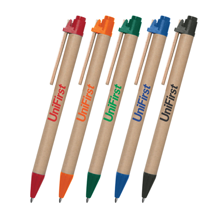 This pen features a paper barrel with a wooden clip. Accent trim available in green, red, orange, blue or black.