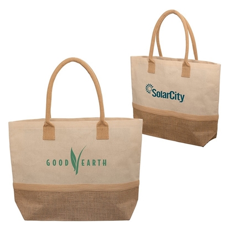 Large open tote bag made of 8 oz. laminated Cotton canvas and laminated Jute. Open interior pocket. 21"l Cotton webbing and rope handles. Do not wash. Wipe clean with warm rag. Do not iron. Recommended weight tolerance: 15 lbs.